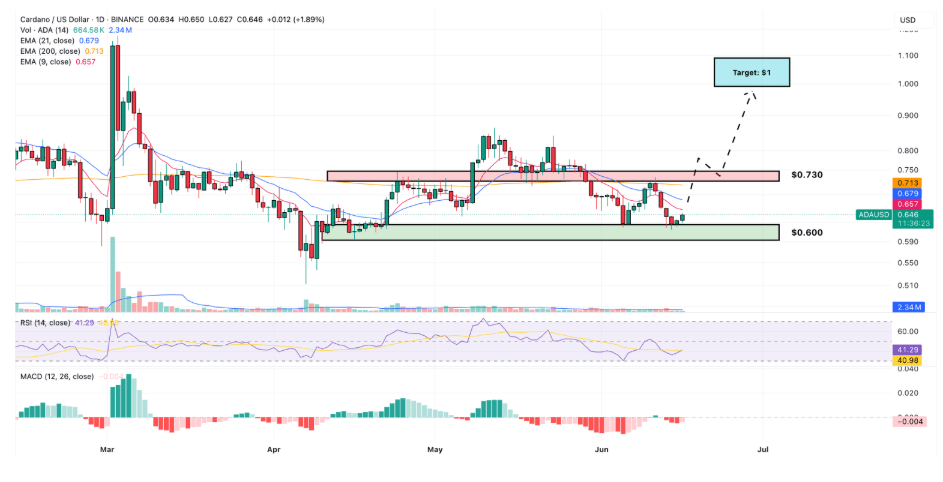 Cardano (ADA) si è ripreso durante la settimana dopo una striscia di perdite di 4 giorni. Il livello di $0.600 sembra aver agito come un forte supporto per l'azione dei prezzi e potrebbe innescare un movimento verso la resistenza di $0.7500 nel breve termine.