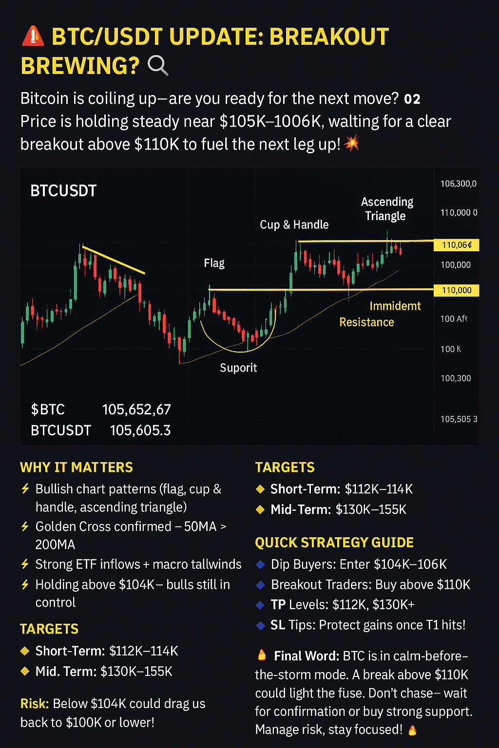 Il prezzo si mantiene stabile vicino a $105K–$106K, in attesa di una chiara rottura sopra $110K per alimentare il prossimo rialzo! 💥