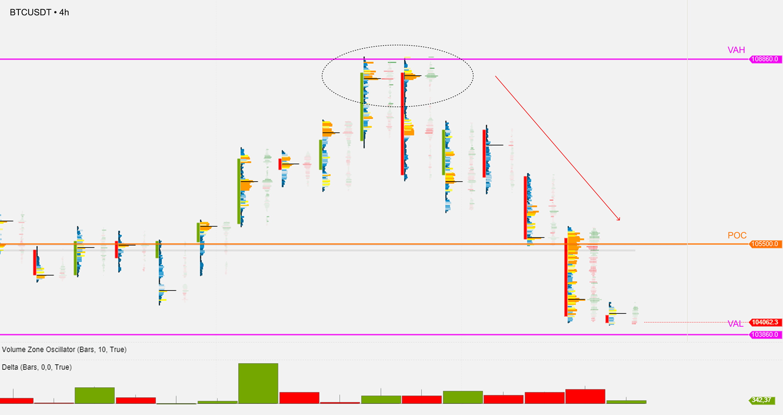 Dopo l'approccio al livello VAH - 108860, il prezzo ha mostrato una buona reazione verso il basso, indicando una possibile diminuzione su VAL - 103860.