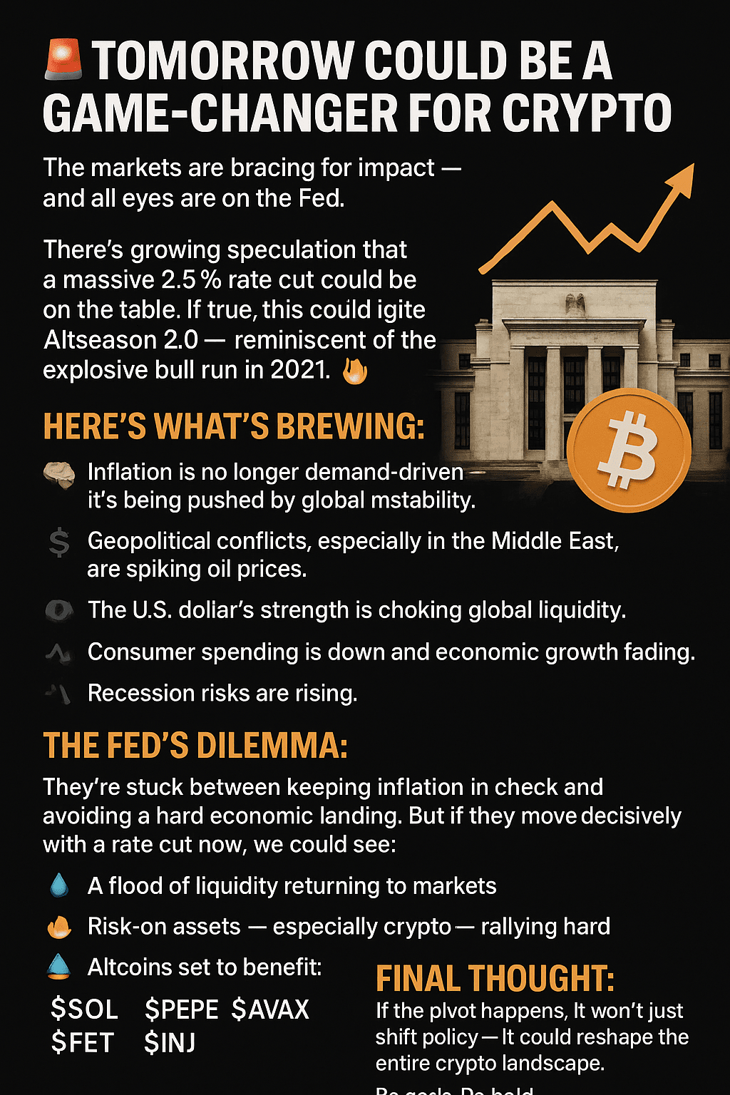 C'è crescente speculazione che un enorme taglio dei tassi del 2,5% potrebbe essere sul tavolo. Se vero, questo potrebbe accendere l'Altseason 2.0 — che ricorda il esplosivo mercato rialzista del 2021. 🔁🔥