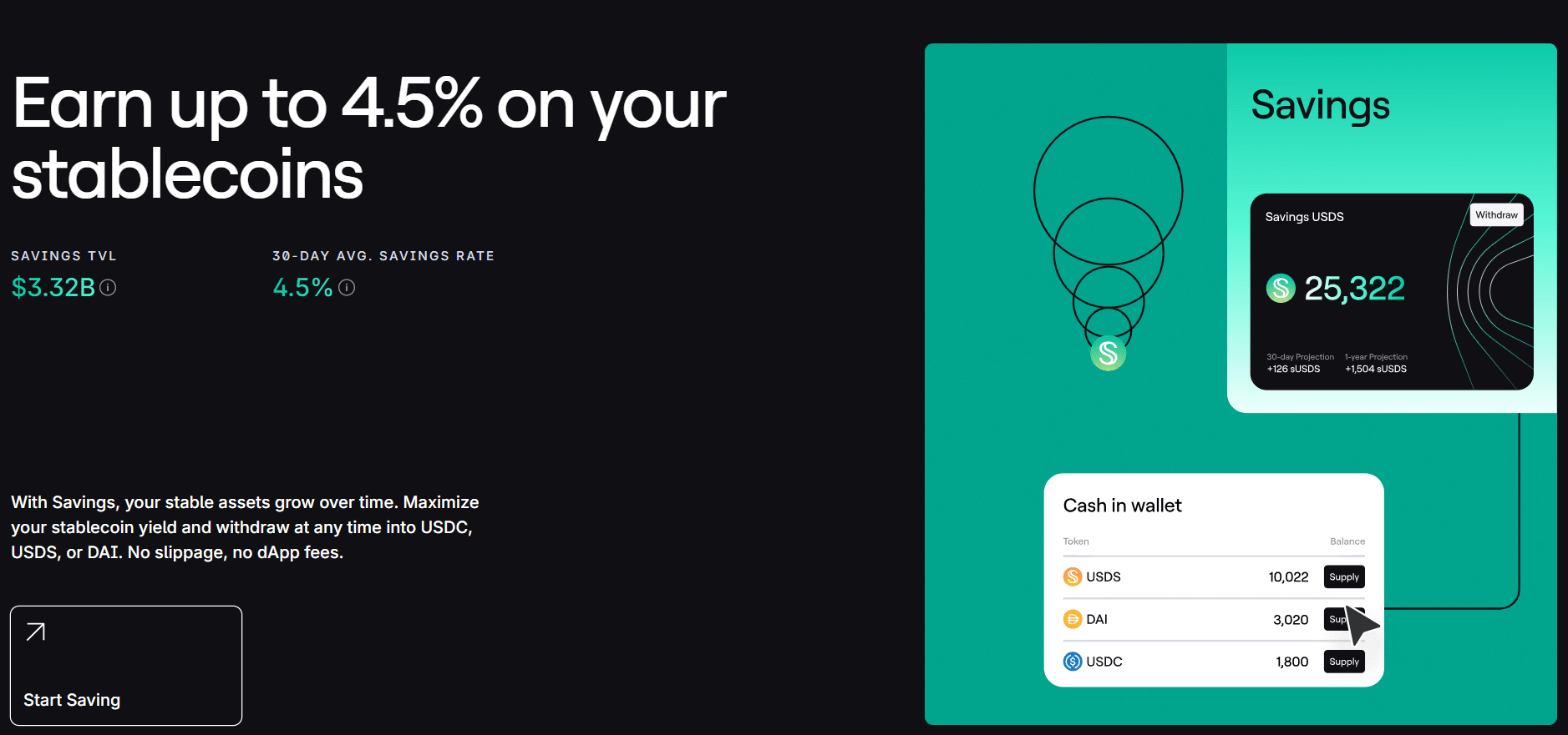 Un prodotto per guadagnare rendimento su stablecoin come USDC e USDS (e presto, USDT) convertendoli in sUSDS o sUSDC che generano rendimento. Guadagna fino al 4,5% sulle tue stablecoin.