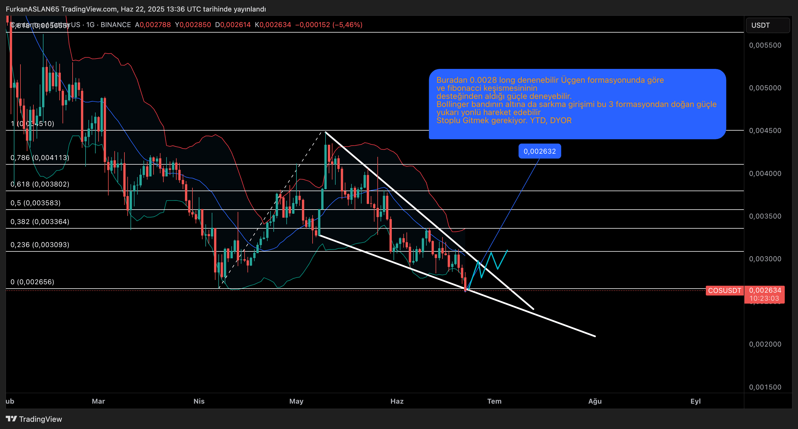 La coppia COS/USDT si sta attualmente muovendo all'interno di un modello di triangolo discendente e trovando supporto al livello di Fibonacci di $0.00265. Un tentativo di rompere sotto la banda inferiore di Bollinger è fallito, il che potrebbe segnalare l'inizio di un movimento ascendente.