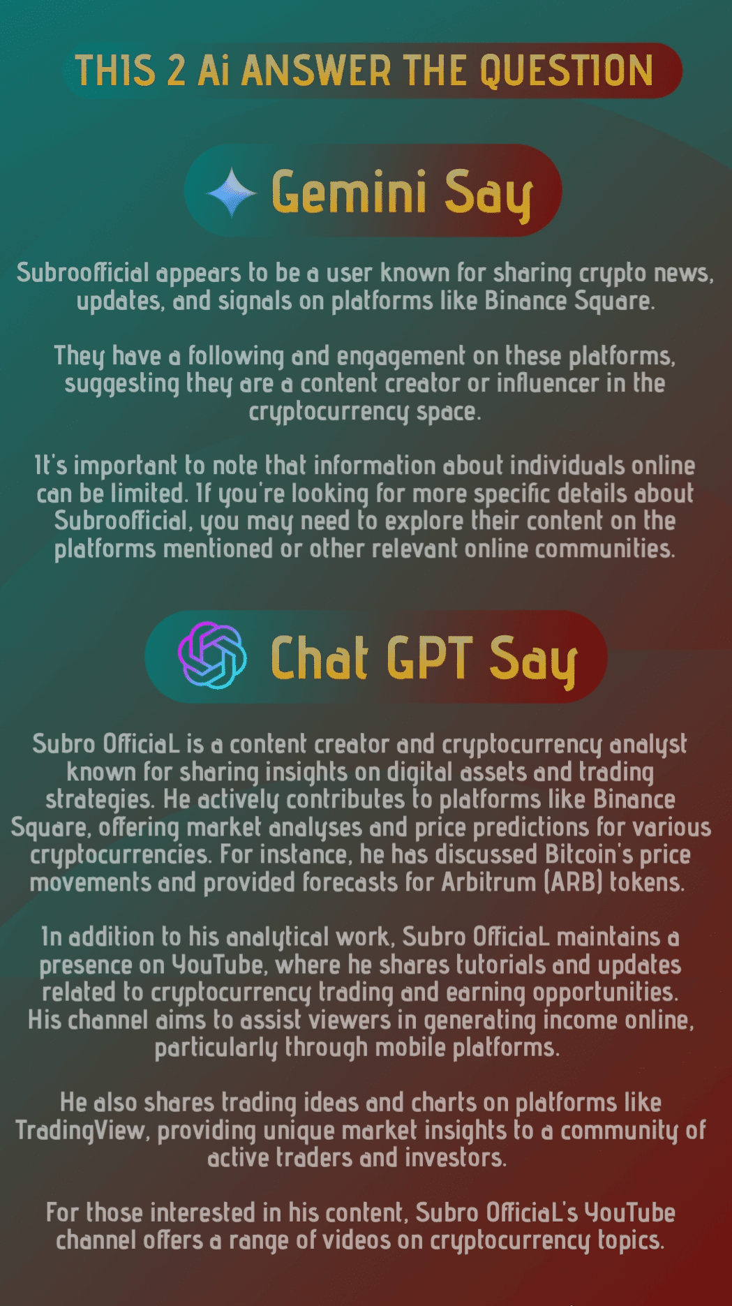 In sostanza, "SUBROOFFICIAL" è un analista dei mercati crypto e finanziari che fornisce le proprie opinioni e idee di trading attraverso varie piattaforme online.