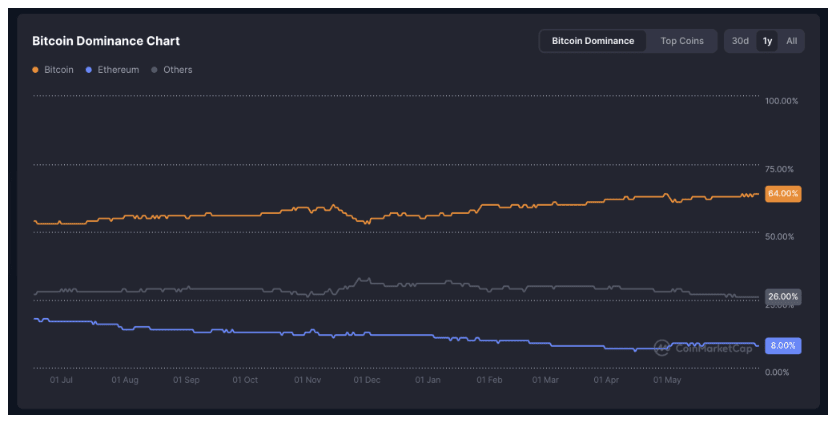 I dati di CoinMarketCap mostrano che la dominanza di BTC è aumentata costantemente nell'ultimo anno, passando dal 54,1% di giugno 2024 al 64% ad oggi. Di conseguenza, la dominanza di ETH è scesa dal 18,2% all'8%.