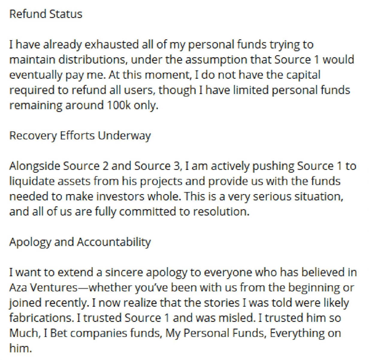 Ora, Aza Ventures ammette che solo $100.000 rimangono liquidi dai loro "fondi personali" utilizzati per cercare di "mantenere le distribuzioni" – una miseria rispetto ai $50 milioni persi. Le loro recenti dichiarazioni, come quella qui sotto, delineano i loro sforzi ma dipingono un cupo quadro finanziario:
