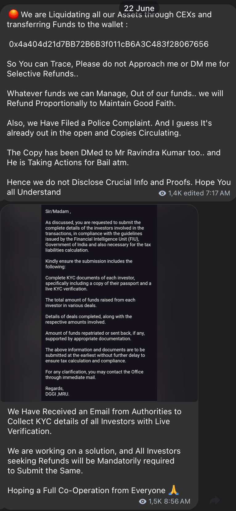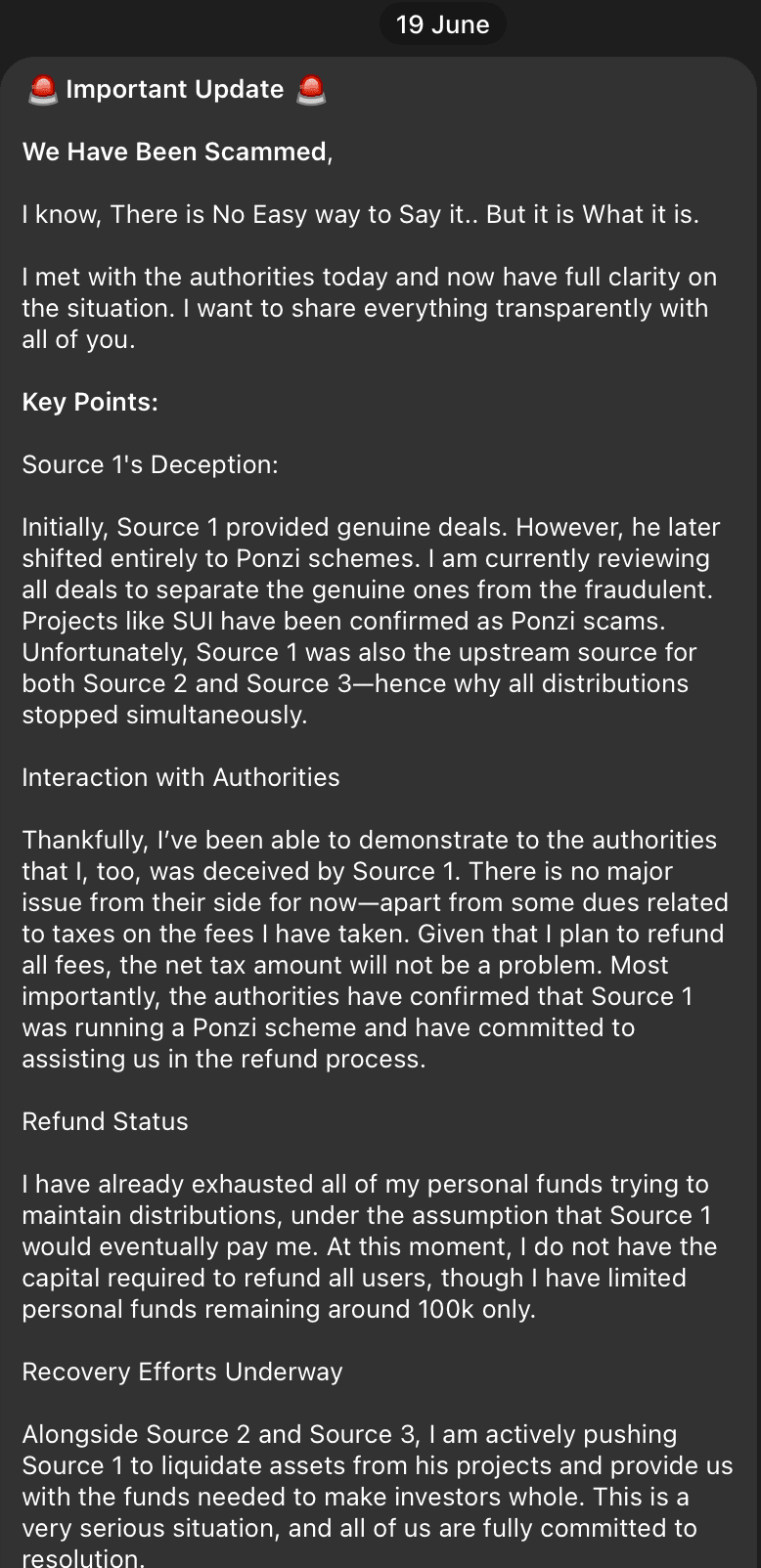 Entro il 19 giugno, Aza Ventures, uno dei broker di affari più prominenti in questo mercato opaco, confessò finalmente. Il loro scioccante "Aggiornamento Importante" su Telegram leggeva: “Siamo stati truffati.” Rivelarono che la "Fonte 1" dietro gli affari si era volatilizzata.