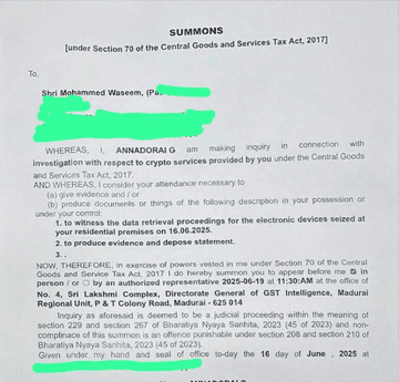 Le autorità fiscali indiane non stanno prendendo questa cosa alla leggera. Hanno recentemente perquisito le operazioni di Aza, sequestrato dispositivi e avviato un'indagine sull'evasione fiscale crypto OTC. Una convocazione diretta a Mohammed Waseem dettaglia un'indagine riguardo ai "servizi crypto forniti da te ai sensi della Legge Centrale sui Beni e Servizi, 2017."