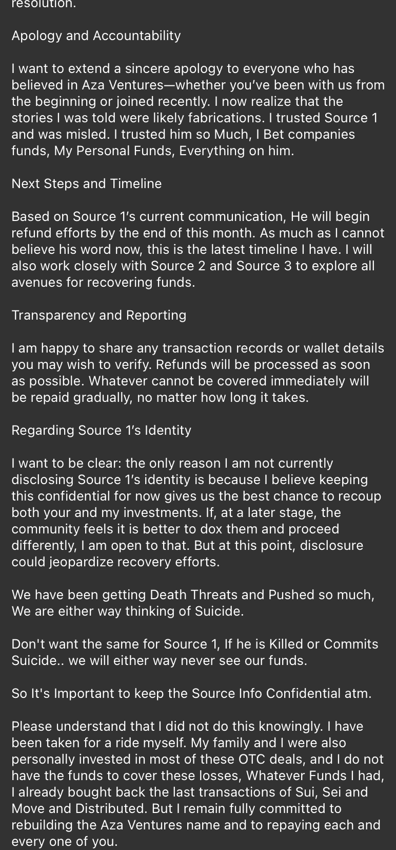 La comunità è sotto shock, devastata e unita nella ricerca di giustizia. ### Aza Ventures: Vittima o Co-Conspiratore? Aza Ventures, una volta celebrata come una porta d'accesso a affari esclusivi, è ora sotto intensa scrutinio. Pubblicamente, affermano di essere vittime, dichiarando: "Anche noi siamo stati vittime." Tuttavia, le loro dichiarazioni passate contraddicono i loro attuali guai finanziari. Solo poche settimane prima del collasso, il CEO di Aza Ventures, Waseem, dichiarò con sicurezza in una chat Telegram: **"Per gli OTC Aza Ventures ha garantito allocazione. Quindi se il venditore non invia, rimborseremo o invieremo token... Gestiamo un fondo di oltre $200M+. Gli OTC sono molto piccoli."**