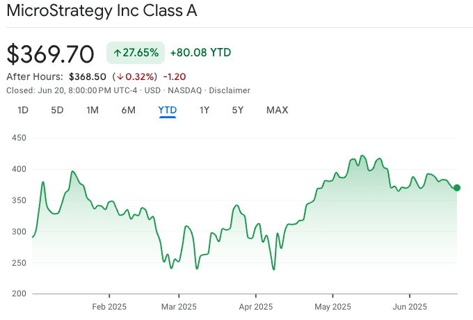 Le azioni di MicroStrategy Inc. (MSTR) sono aumentate di quasi il 28% quest'anno, avendo recuperato da un minimo di poco sotto i 238 dollari all'inizio di aprile. Fonte: Google Finance