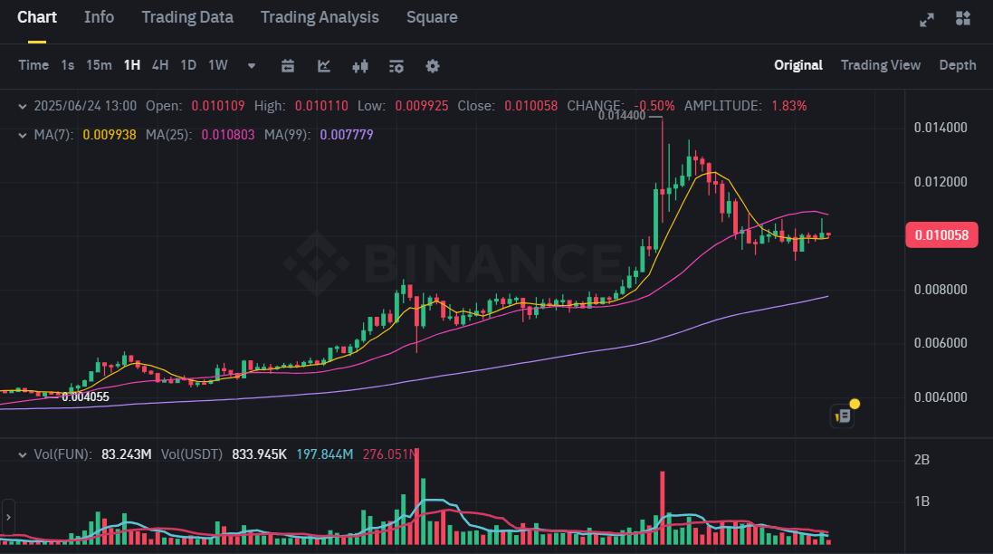 Dopo diversi giorni consecutivi di forte momentum rialzista, $FUN ha appena completato un rally parabolico da manuale, toccando un picco vicino a 0.014400 USDT prima di entrare in una tanto necessaria consolidazione. Sebbene il recente ritracciamento possa sconcertare i trader a breve termine, gli investitori esperti sanno: questa pausa potrebbe essere la base per la prossima gamba verso l'alto.