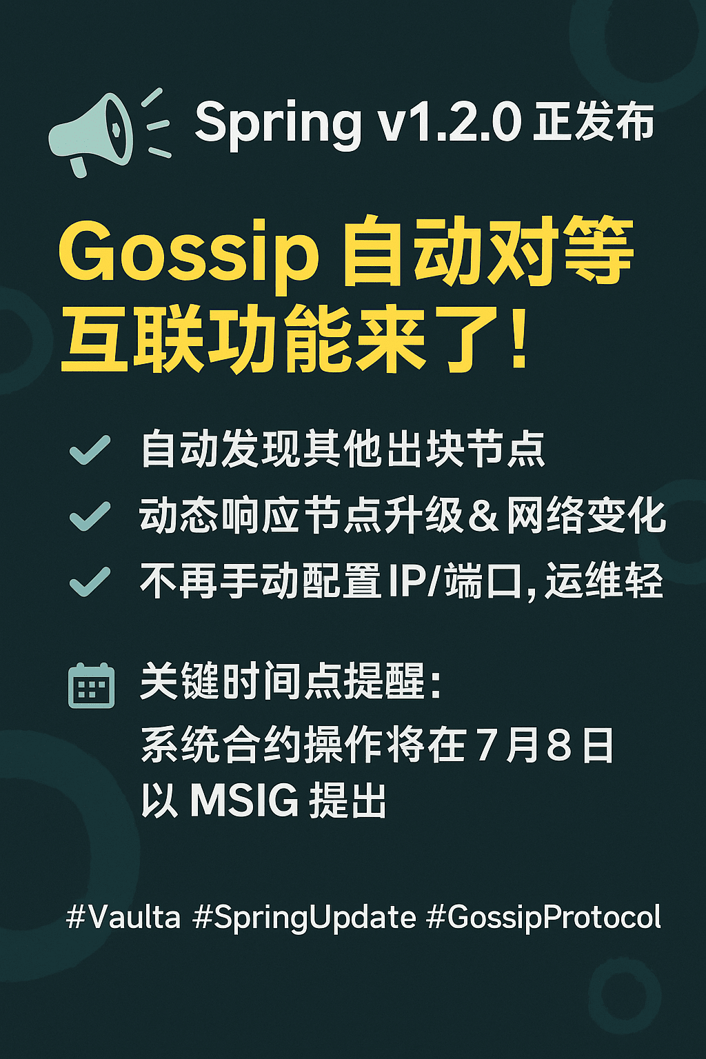🚨La mainnet Vaulta Spring v1.2.0 è ufficialmente rilasciata: la funzione di interconnessione automatica Gossip è arrivata!