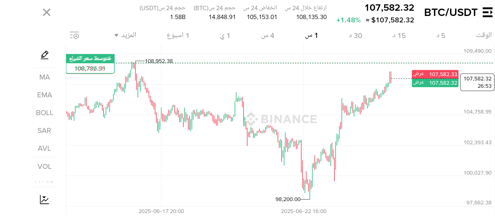 Il prezzo si sta attualmente avvicinando all'area in cui c'era il massimo (108,952), e potrebbe subire una correzione temporanea o un'inversione.