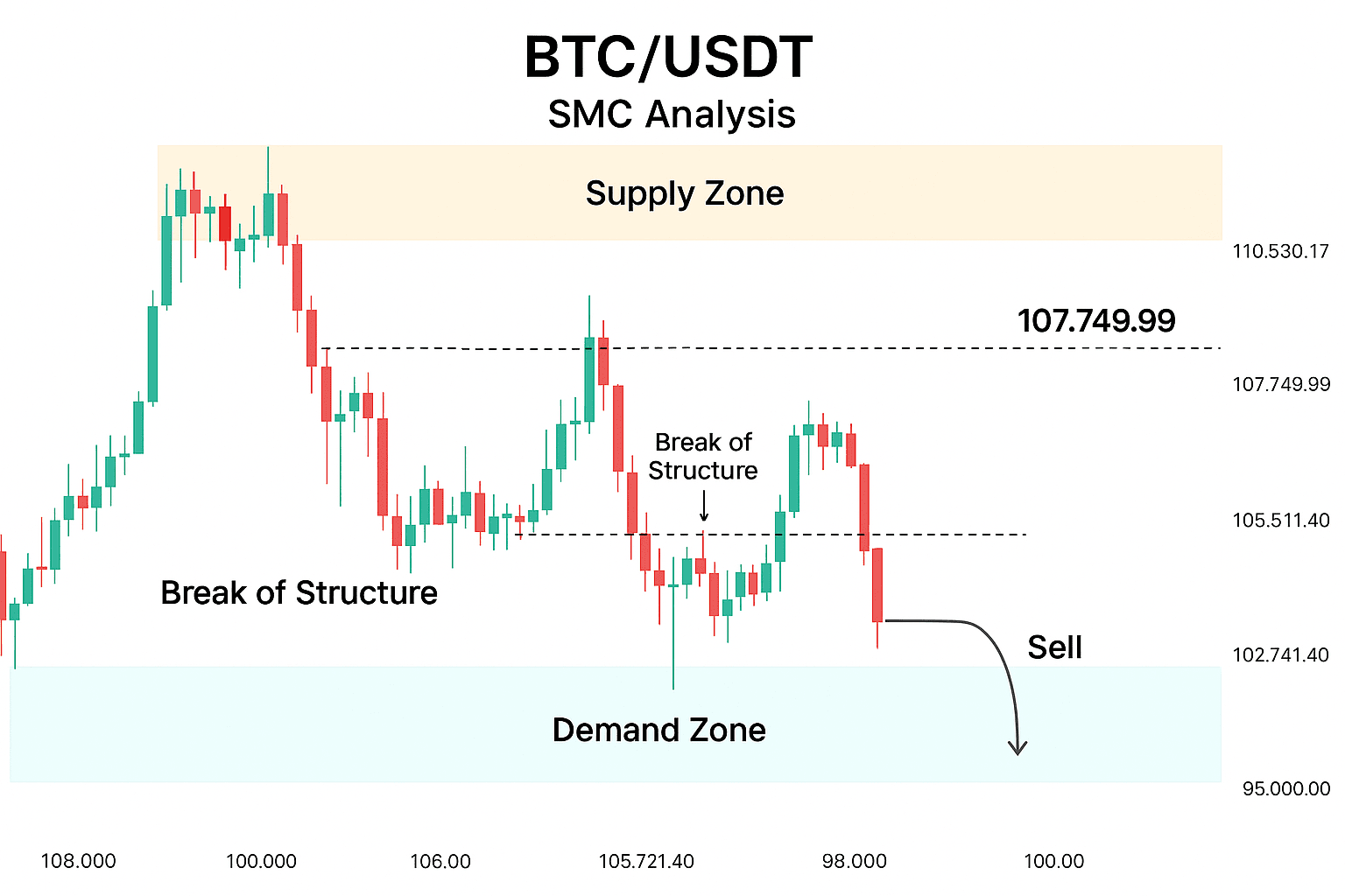 Zona di domanda forte (Demand Zone): tra 98,000 e 100,000 — il prezzo è rimbalzato fortemente dopo una chiara trappola di liquidità.