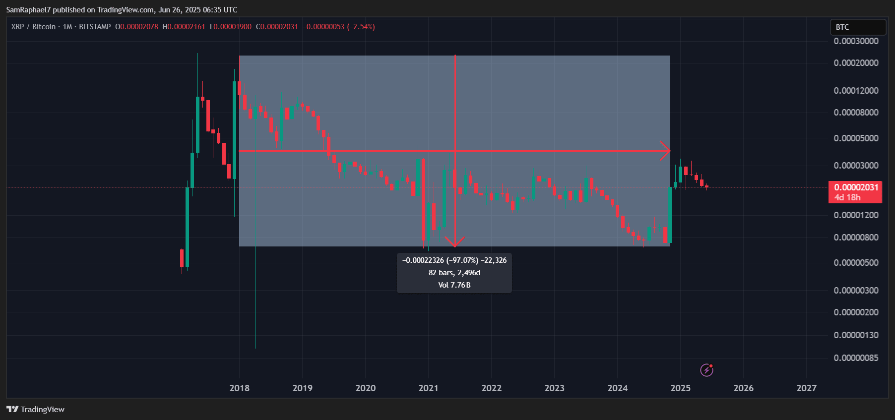 Secondo lui, la "strategia vincente" ideale era entrare nel mercato di Bitcoin dal 2022 al 2024, mentre le prestazioni di Bitcoin superavano quelle di Ripple, per poi convertire alcune partecipazioni in Bitcoin in Ripple al momento dell'individuazione del doppio fondo sul grafico Ripple/Bitcoin. Questo avrebbe permesso all'investitore di vincere da entrambi i lati: dalla corsa di Bitcoin dal 2022 al 2024 e dalla rottura di Ripple.