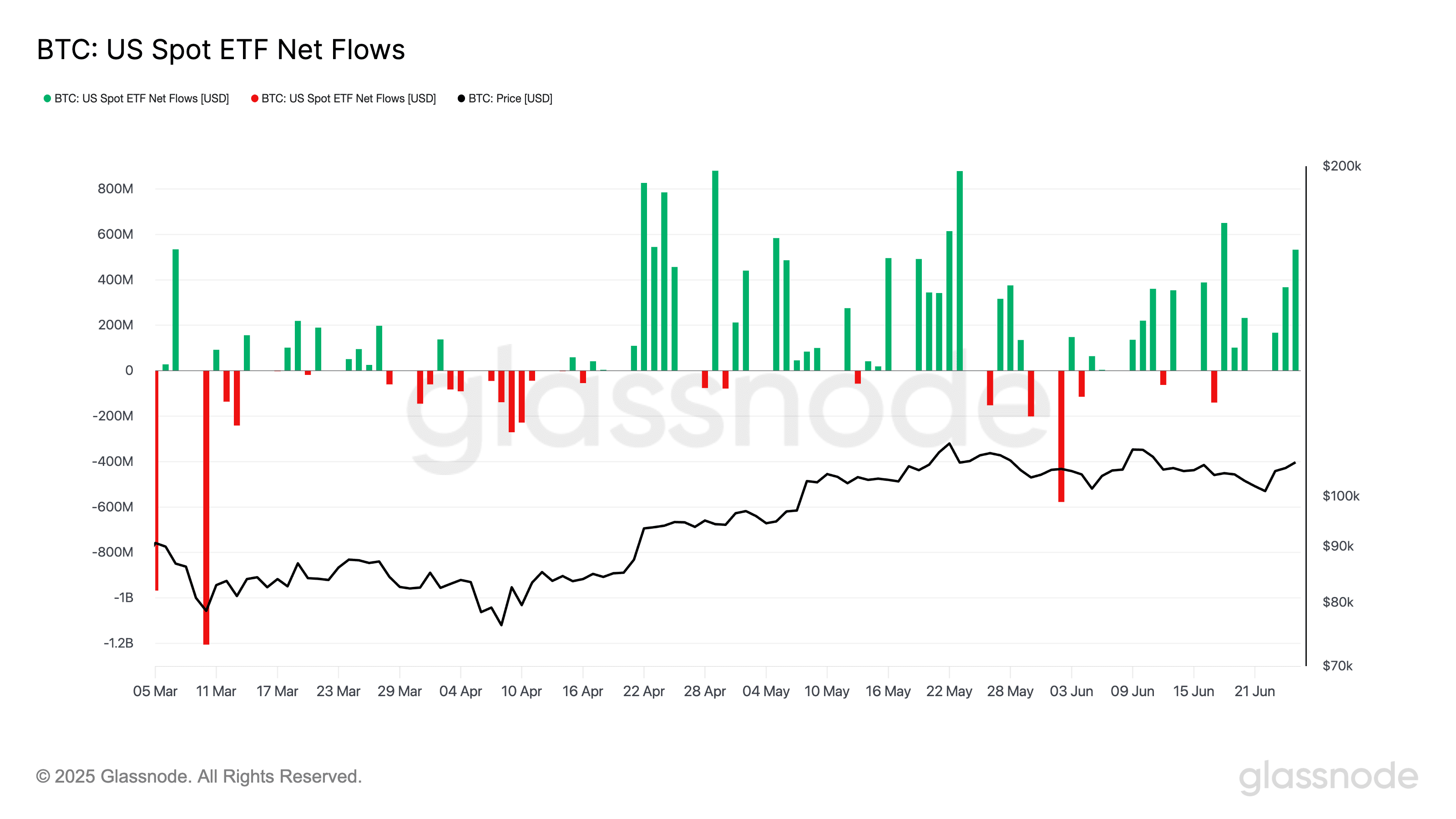 A partire dal 25 giugno, questi ETF detenevano 1,234 miliardi di BTC, un aumento di oltre 9,722 BTC negli ultimi tre giorni, secondo i dati di Glassnode. Questo rappresenta circa 1,04 miliardi di dollari in afflussi netti finora questa settimana.