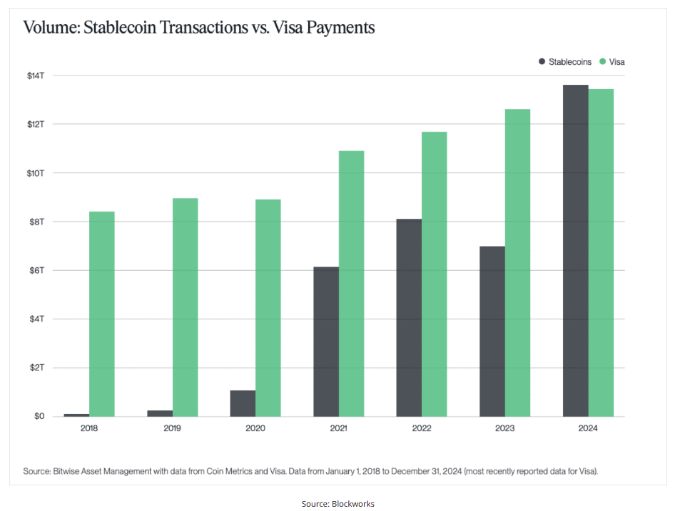 Le stablecoin hanno già superato Visa in volume e stanno guadagnando terreno con i principali rivenditori come Amazon e Walmart.
