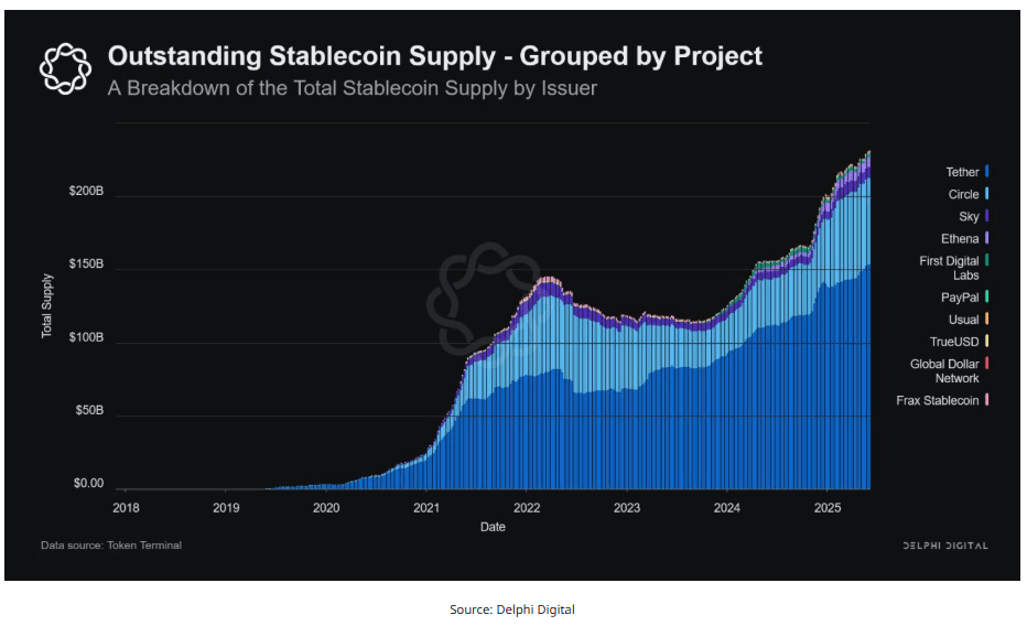 Secondo Delphi Digital, più di 120 miliardi di dollari in obbligazioni del Tesoro USA sono ora al sostegno dei stablecoin. L'adozione istituzionale sta crescendo. Tether (USDT) e Circle (USDC) dominano ancora il mercato, ma nuovi attori stanno entrando con nuove idee. Ad esempio, il stablecoin Ethena (ENA) si è guadagnato una nicchia con il suo programma orientato al rendimento.