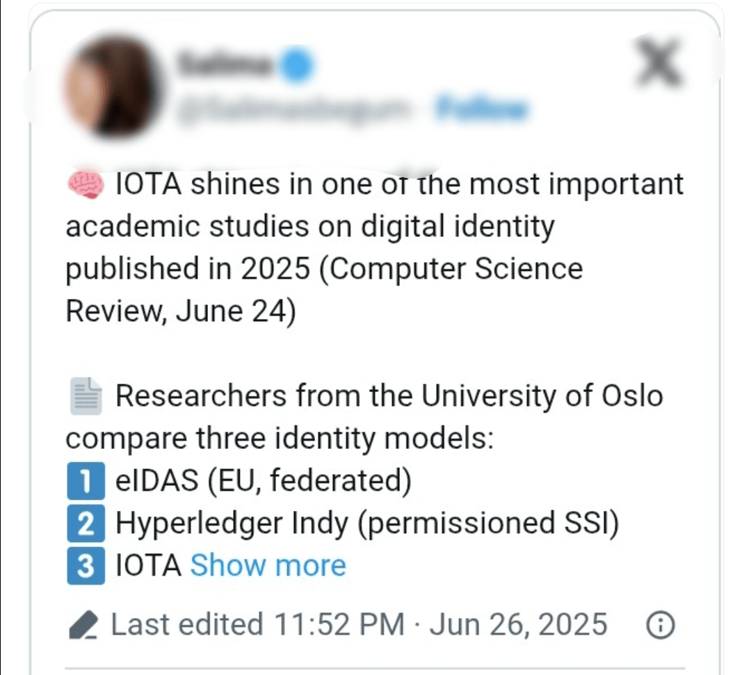 Il $IOTA ha ricevuto riconoscimenti significativi in uno studio accademico di alto livello sull'identità digitale pubblicato nel 2025. Secondo una revisione di CNF, i ricercatori dell'Università di Oslo in Norvegia hanno guidato lo studio intitolato "Tendenze della decentralizzazione nella gestione dell'identità: dai sistemi di gestione dell'identità federati ai sistemi di gestione dell'identità sovrana".