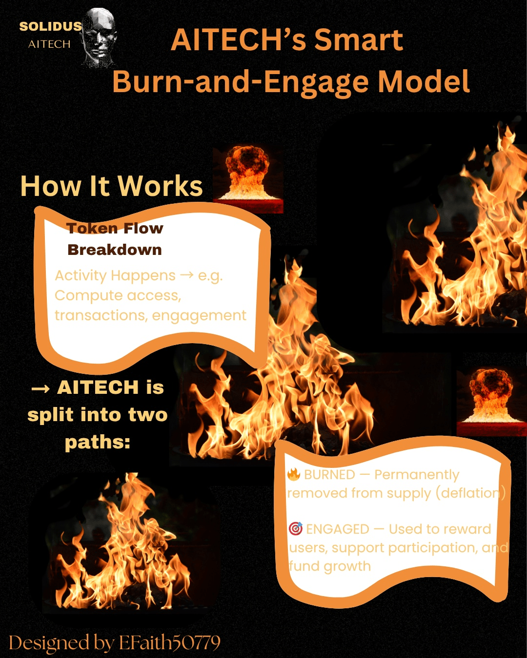 Alla base, il modello di AITECH è basato sull'attività. Invece di bruciare token a caso o a intervalli fissi, una parte di $AITECH token viene bruciata in base all'attività degli utenti e della piattaforma.