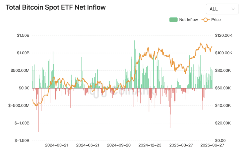 I dati di CoinAnk mostrano che la scorsa settimana l'ETF Bitcoin spot ha registrato un afflusso netto di 2,22 miliardi di dollari, continuando il trend di afflusso netto per tre settimane. L'ETF Bitcoin spot con il massimo afflusso netto settimanale è stato l'ETF IBIT di Blackrock, con un afflusso netto settimanale di 1,31 miliardi di dollari, e attualmente l'afflusso netto totale storico di IBIT è di 52,31 miliardi di dollari. L'ETF Bitcoin spot con il massimo deflusso netto settimanale è stato l'ETF GBTC di Grayscale, con un deflusso netto settimanale di 5,69 milioni di dollari, e attualmente il deflusso netto totale storico di GBTC è di 23,25 miliardi di dollari.