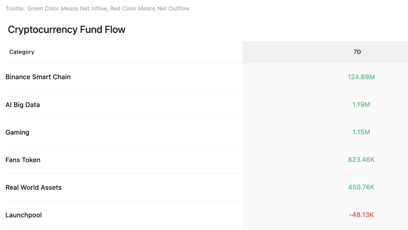 I dati di CoinAnk mostrano che nella scorsa settimana, il mercato delle criptovalute, suddiviso per settori concettuali, ha visto solo Binance Smart Chain, AI Big Data, settori di gioco e token di fan registrare un afflusso netto di capitale, mentre il Launchpool ha mostrato un deflusso relativamente contenuto.