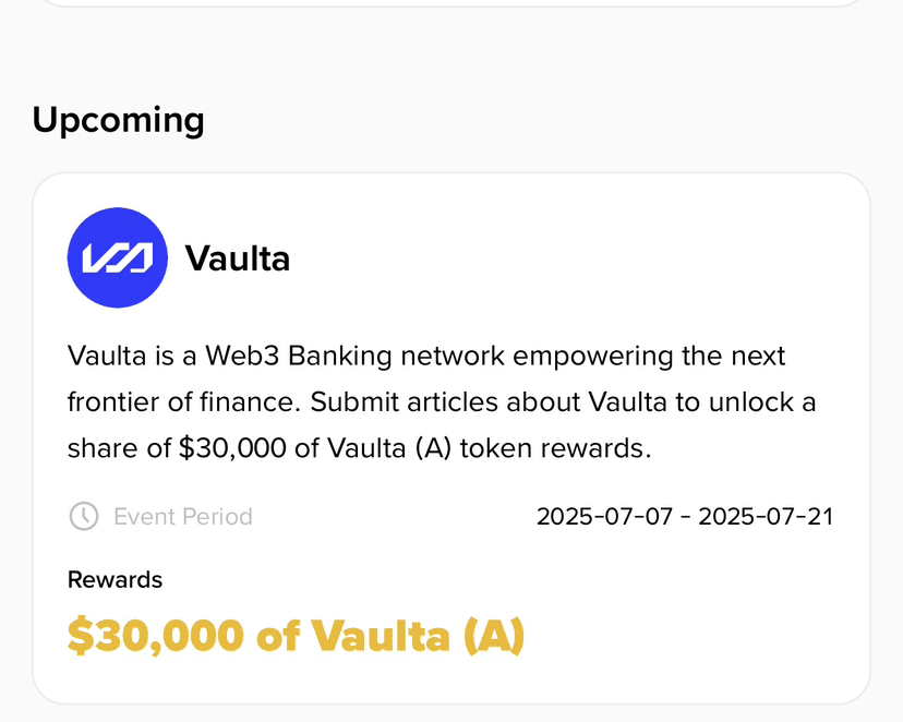 Ecco la tua occasione per guadagnare una quota di $30,000 in token Vaulta (A) semplicemente creando e presentando articoli su Vaulta — una potente nuova rete bancaria Web3 che guida il futuro della finanza decentralizzata. 🚀