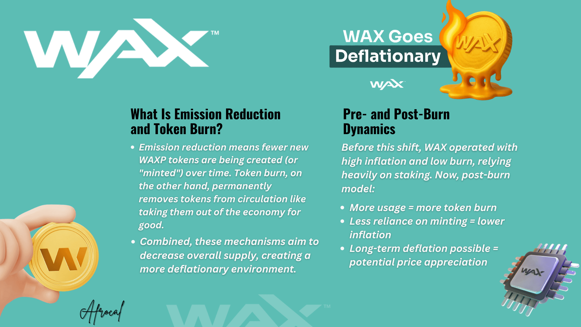 La riduzione dell'emissione significa che vengono creati meno nuovi token WAXP (o "coniati") nel tempo. La combustione dei token, d'altra parte, rimuove permanentemente i token dalla circolazione, come se li togliessimo dall'economia per sempre. Combinati, questi meccanismi mirano a ridurre l'offerta complessiva, creando un ambiente più deflazionistico.