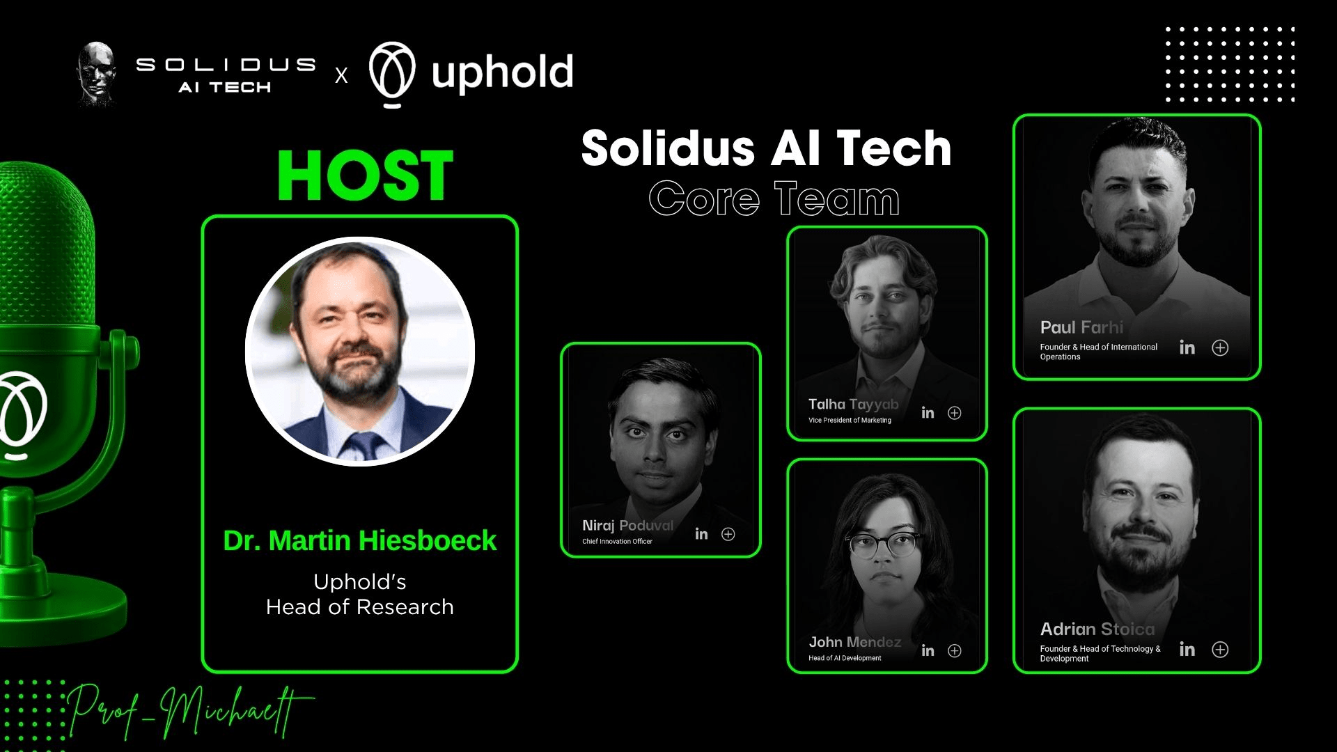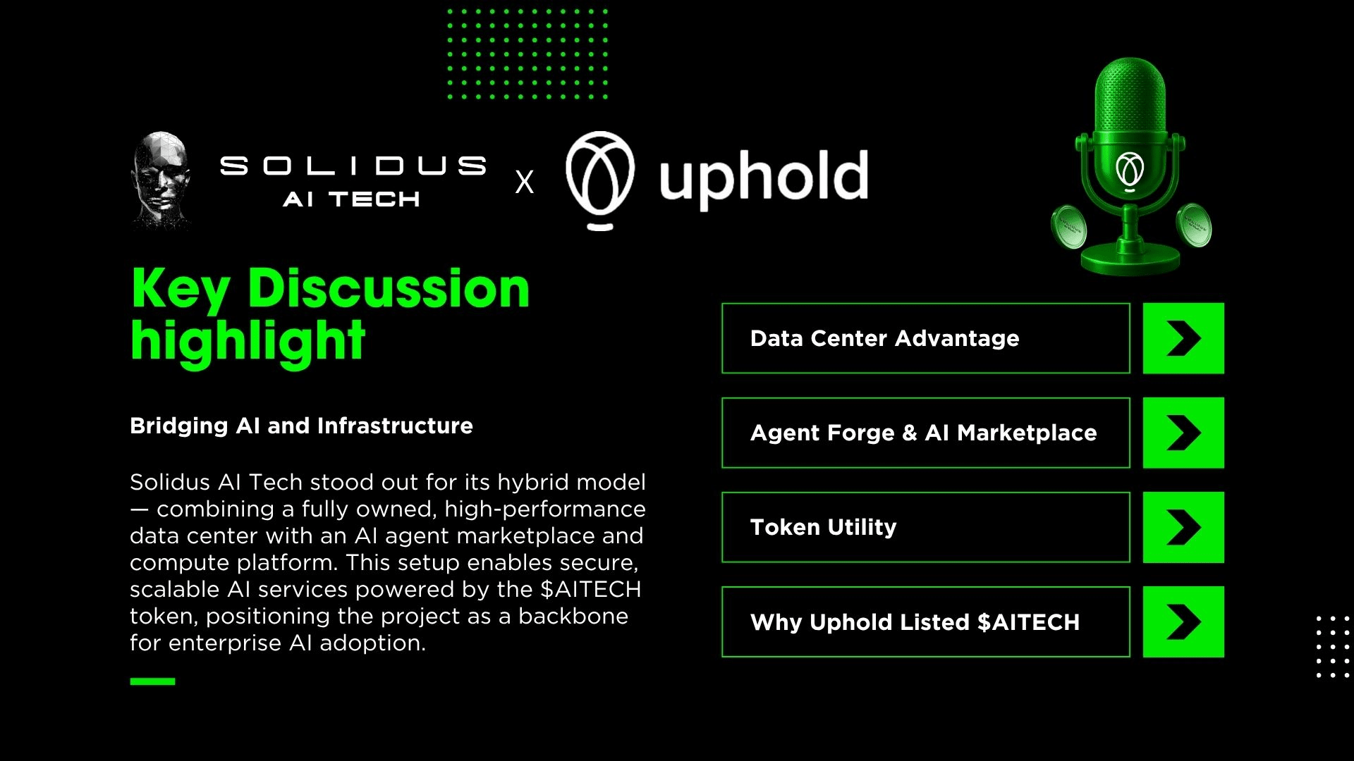 Perché Uphold ha elencato $AITECH: Martin Hiesboeck ha sottolineato la credibilità di Solidus, affermando che tra i molti progetti crypto AI che cercano un listing, Solidus si è distinto per la sua infrastruttura tangibile, un chiaro percorso di conformità e un modello di business di livello istituzionale.