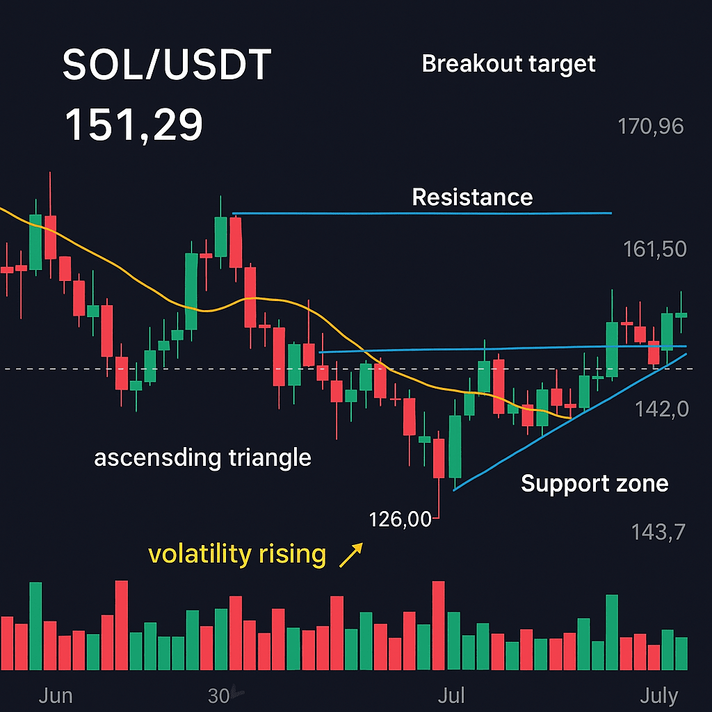 Solana si sta avvolgendo sotto un livello chiave di rottura. La struttura del triangolo ascendente e una forte base attorno alle medie mobili a 25 e 99 giorni suggeriscono che i tori stanno accumulando pressione — ma hanno bisogno di una spinta pulita sopra $161.5 con volume per confermarlo.