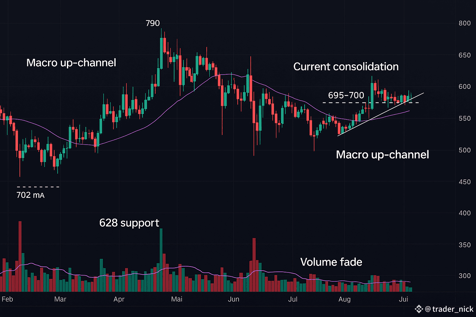 External sentiment: Fresh commentary from research desks pegs a first‑target breakout zone at $ 680‑$ 700, with Brave New Coin eyeing $ 680 as the “technical magnet” if current resistance gives way bravenewcoin.com. Binance‑Square contributors paint a slightly broader $ 700‑$ 800 upside window for Q3, provided macro conditions stay calm generallink.top.