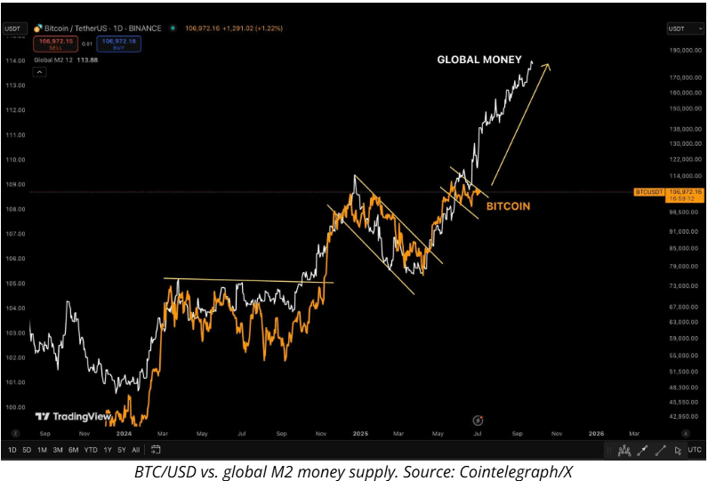 Poiché Cointelegraph continua a riportare, le scommesse rialziste sul prezzo di BTC sono anche alimentate da un'espansione dell'offerta di denaro M2 globale.