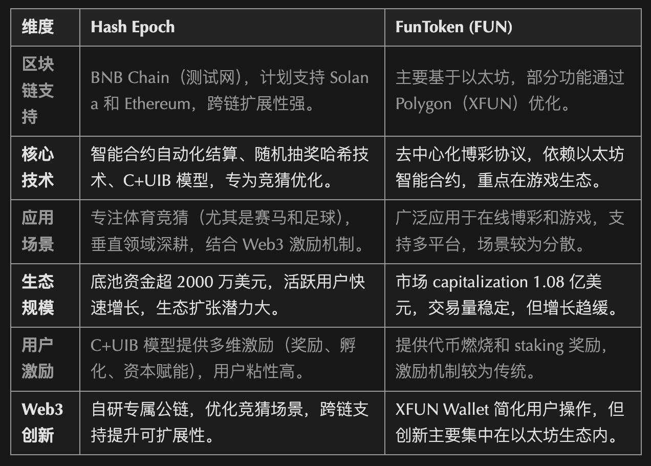 Cross-chain e blockchain esclusiva: il supporto cross-chain di Hash Epoch (BNB Chain, Solana, Ethereum) e la propria HashEpoch Sports Chain offrono maggiore velocità di transazione e costi più bassi, risultando più scalabili rispetto al modello Ethereum + Polygon di FUN. La blockchain esclusiva è su misura per gli scenari di scommesse, ottimizzando l'esperienza utente e l'efficienza ecosistemica.