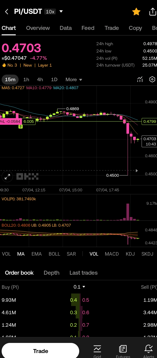 Avviso ⚠️ ⚠️: Investimento ad Alto RischioLa rete Pi (PI) a ~$0.48 USD (4 luglio 2025) è altamente volatile, con oscillazioni giornaliere del 3.51%-8.24% e un calo settimanale del 12.50%-22.28%. Staking senza ricompense, trading IOU, controllo centralizzato (90% dell'offerta di token) e rischi normativi potrebbero portare a perdite significative. Fai le tue ricerche, consulta consulenti e investi solo ciò che puoi permetterti di perdere.
