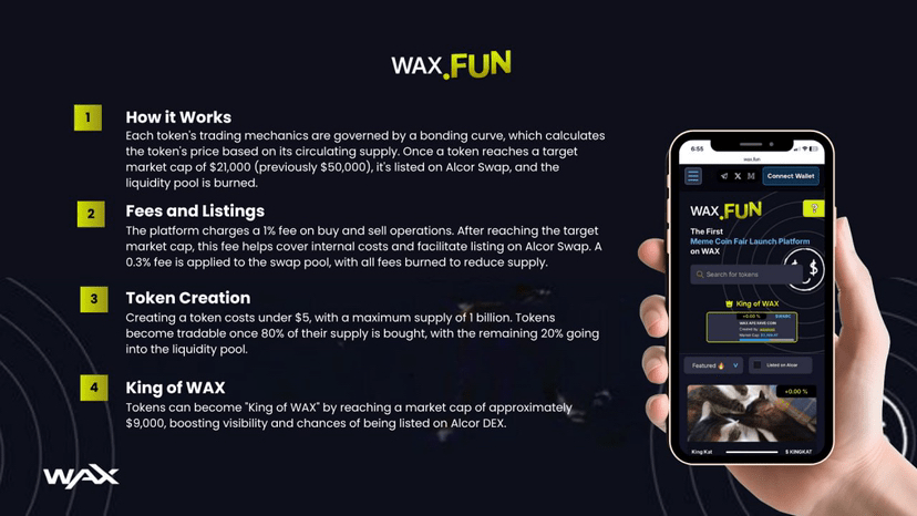 Ogni token parte su un piano di parità. I creatori definiscono solo il nome, il ticker e le immagini. WAX.fun si occupa del resto utilizzando una curva di legame, dove il prezzo del token aumenta man mano che l'offerta cresce.