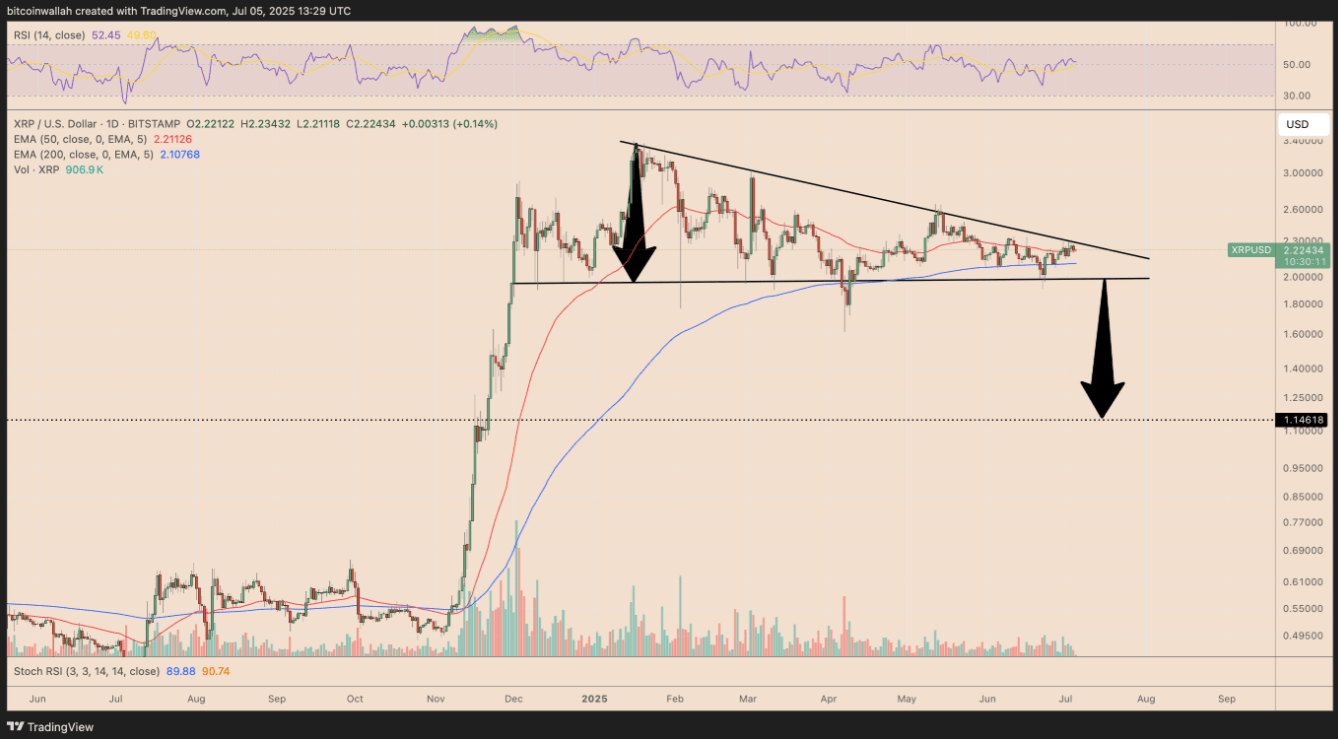 L'analista tecnico Xanrox ha persino emesso un avviso riguardo a una correzione più profonda, basandosi sul modello del triangolo ascendente che si è protratto per molti anni - un modello che ha dominato la tendenza dei prezzi di XRP dal 2017.