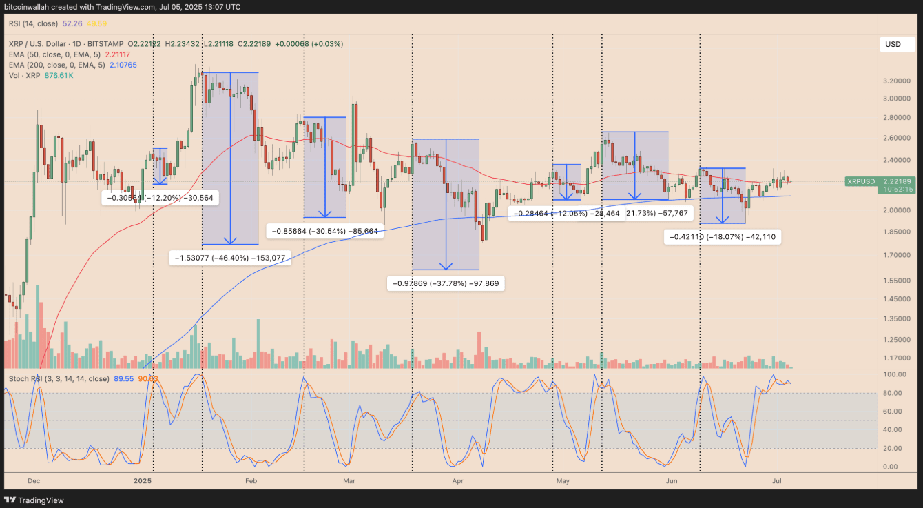 Nel 2025, ogni volta che l'indicatore Stochastic RSI sul frame giornaliero esce dalla zona di ipercomprato, il prezzo di XRP registra una diminuzione media fino al 25%. Attualmente, un modello simile si sta gradualmente formando a luglio, sollevando preoccupazioni che una nuova correzione potrebbe verificarsi a breve nei prossimi giorni o settimane.