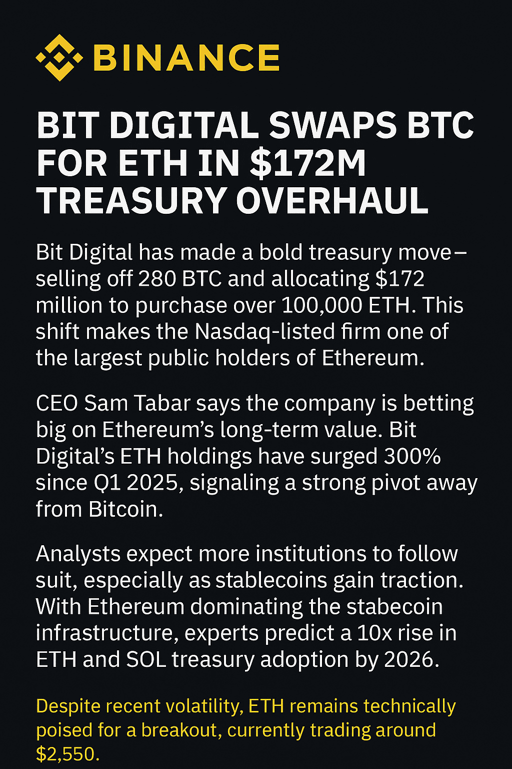 Bit Digital ha effettuato una mossa audace in tesoreria, vendendo 280 BTC e allocando 172 milioni di dollari per acquistare oltre 100.000 ETH. Questo cambiamento rende l'azienda quotata al Nasdaq uno dei maggiori detentori pubblici di Ethereum.