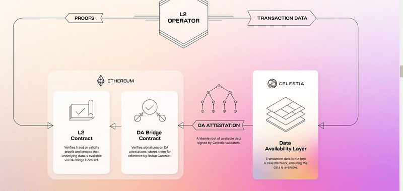 Celestium carica i dati di prova (Proofs) su Ethereum come al solito, ma pubblica i dati della transazione (Transaction Date) su Celestia;