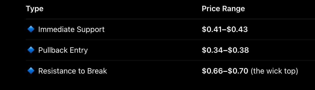 Aspetta un ritracciamento verso $0.34–$0.40 e cerca di mantenere il supporto.