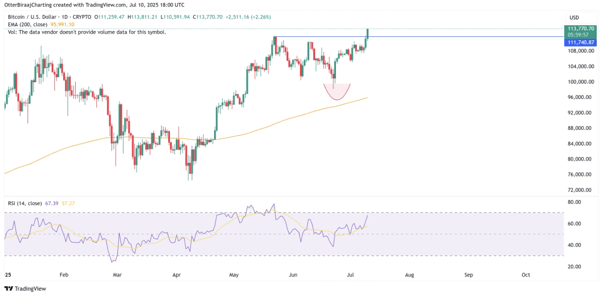sta cercando di chiudere la sua candela giornaliera più alta dopo che BTC è salito a $113,800 giovedì. Con l'asset crittografico che potrebbe entrare in una nuova fase di scoperta dei prezzi, i segnali di liquidità si stanno accendendo, suggerendo che il rally potrebbe avere più carburante nel serbatoio.