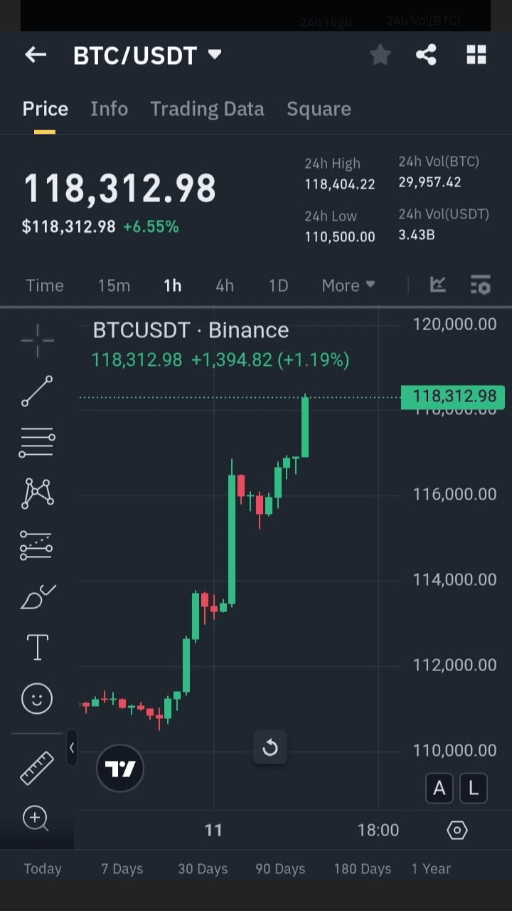 Bitcoin è salito a $118,312.98, guadagnando il 6.55% nelle ultime 24 ore. Questo movimento lo avvicina al livello di resistenza chiave di $120,000, segnalando un momento rialzista con alto volume e forte interesse di mercato.