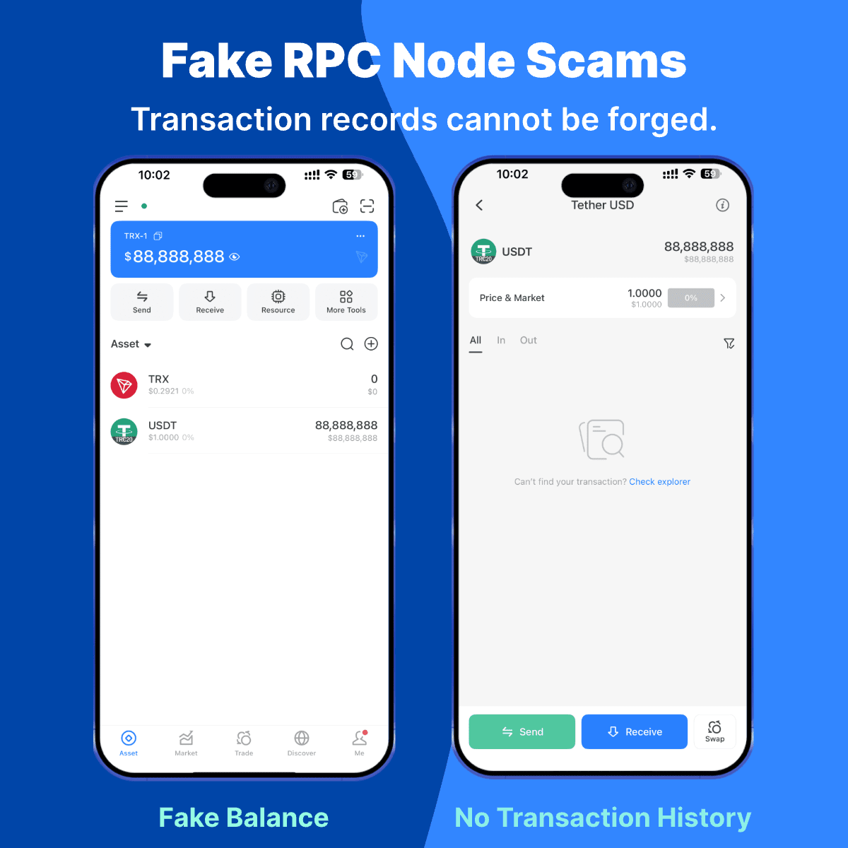 I nodi falsi manipolano solo la visualizzazione del saldo del tuo portafoglio — non possono forgiare registri di transazione reali!