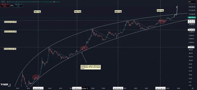 Il trader noto con il pseudonimo Kaleo racconta ai suoi 706.400 follower sulla piattaforma di social media X che il prezzo di 500.000 USD del Bitcoin è un "magnete" basato sul canale di regressione logaritmica.