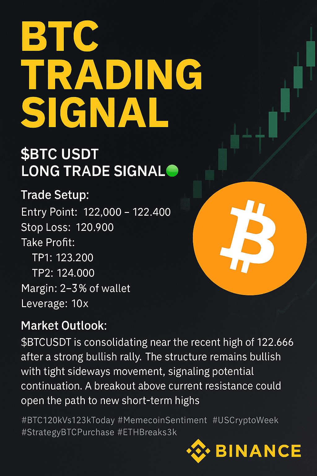 $BTCUSDT si sta attualmente consolidando vicino all'alto recente di 122.666 dopo un forte rally rialzista. La struttura rimane rialzista, con un movimento laterale ristretto — un classico setup per una potenziale continuazione. Un breakout sopra la resistenza attuale potrebbe aprire la strada a guadagni a breve termine e nuovi massimi.