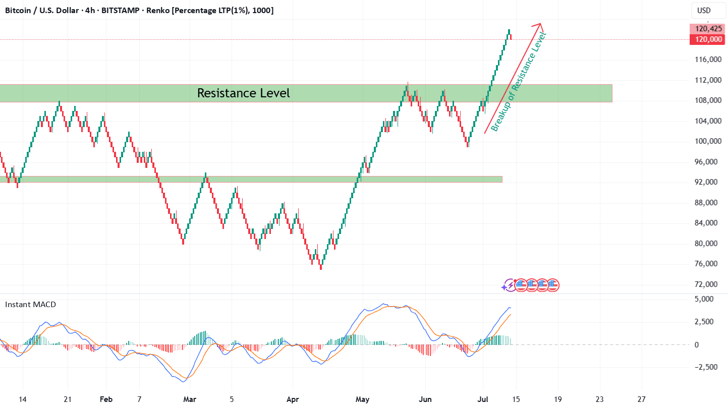 La rottura sopra la resistenza di 108.000 segna l'inizio di un probabile nuovo trend rialzista per BTC (ora 119.000).