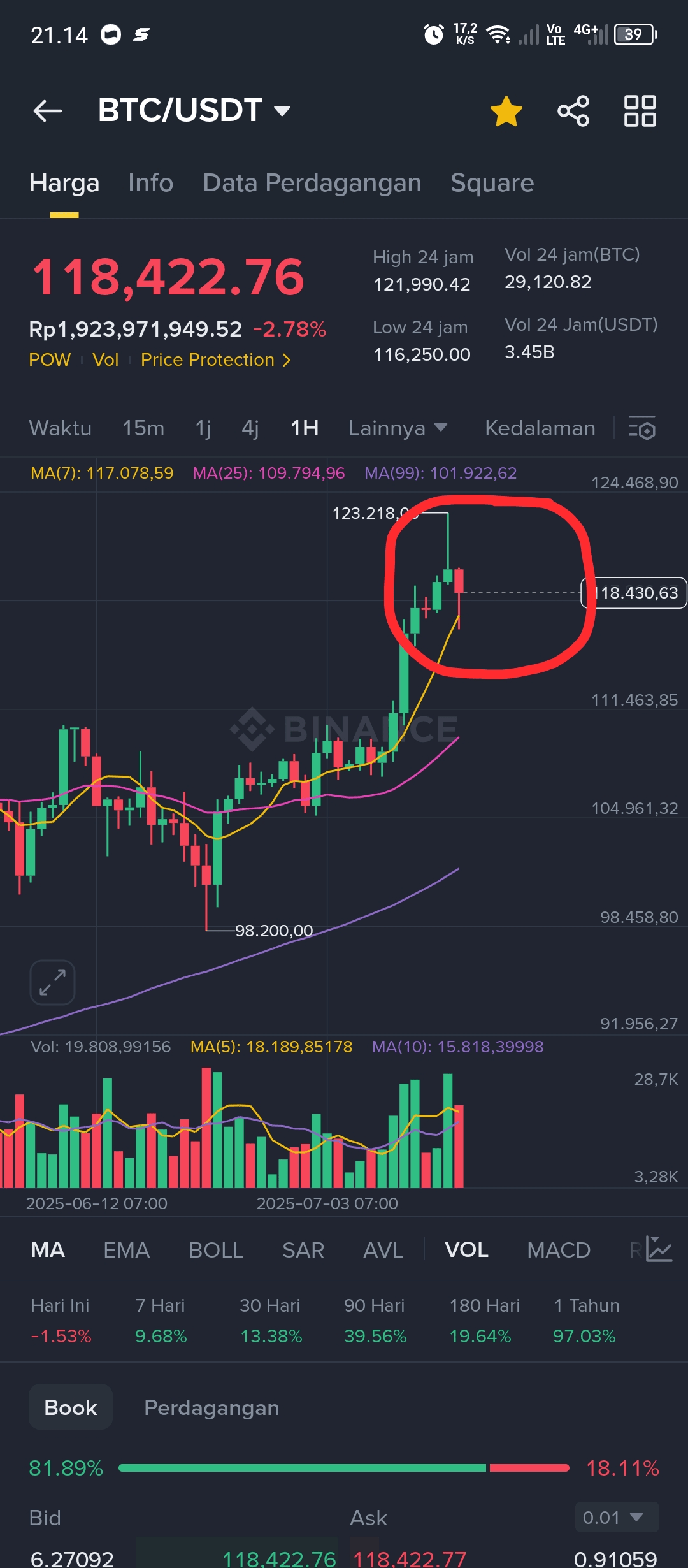 Bitcoin (BTC/USDT) è sceso del 2,78% nelle ultime 24 ore e attualmente viene scambiato attorno a 118.422 USDT. Nonostante abbia brevemente toccato un massimo di 123.218 USDT durante la sessione di trading, la pressione di vendita è tornata a dominare.