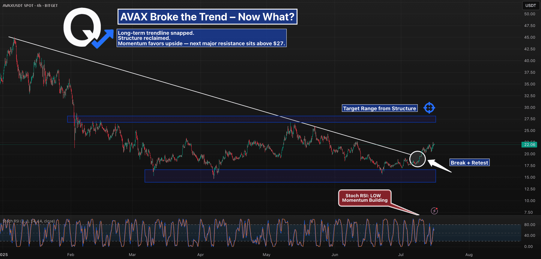 AVAX ha rotto una linea di tendenza discendente di lunga data e ha confermato la rottura con un retest pulito.