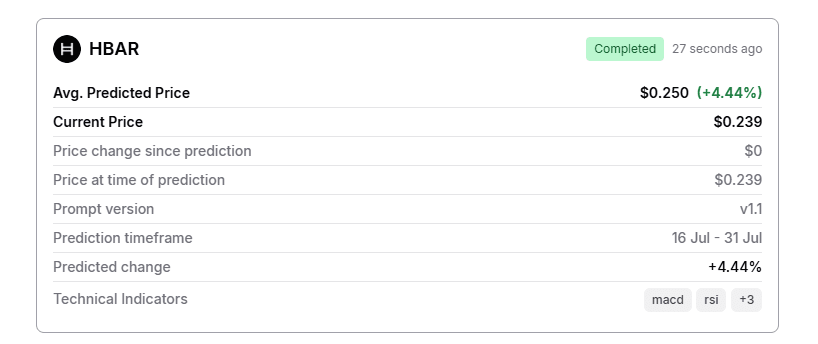Secondo il modello di previsione dei prezzi basato sull'intelligenza artificiale di Finbold, si prevede che il prezzo $HBAR raggiunga 0,250 dollari entro il 31 luglio (con un aumento del 4,44% rispetto al prezzo attuale).