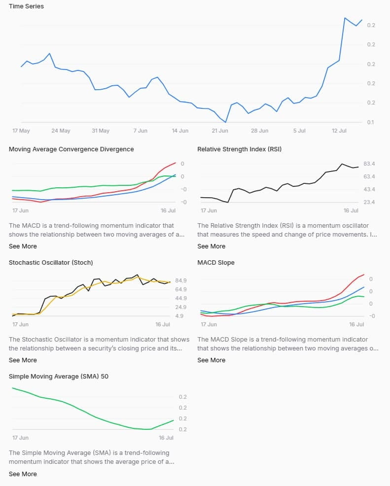 Il modello di previsione si basa su un quadro multi-indicatore, considerando la convergenza e la divergenza della media mobile (MACD), l'indice di forza relativa (RSI), l'oscillatore stocastico, la pendenza del MACD e la media mobile semplice a 50 giorni (SMA).