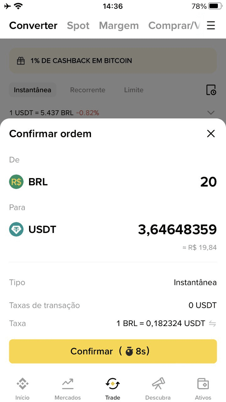 In Binance, la funzione “Convertire” ha permesso di effettuare l'acquisto in modo diretto, senza reindirizzamenti né costi nascosti. La conversione è stata di 1 BRL = 0,182324 USDT, risultando in 3,64 USDT, senza commissioni. Tutto il processo è stato fluido e all'interno dell'app.